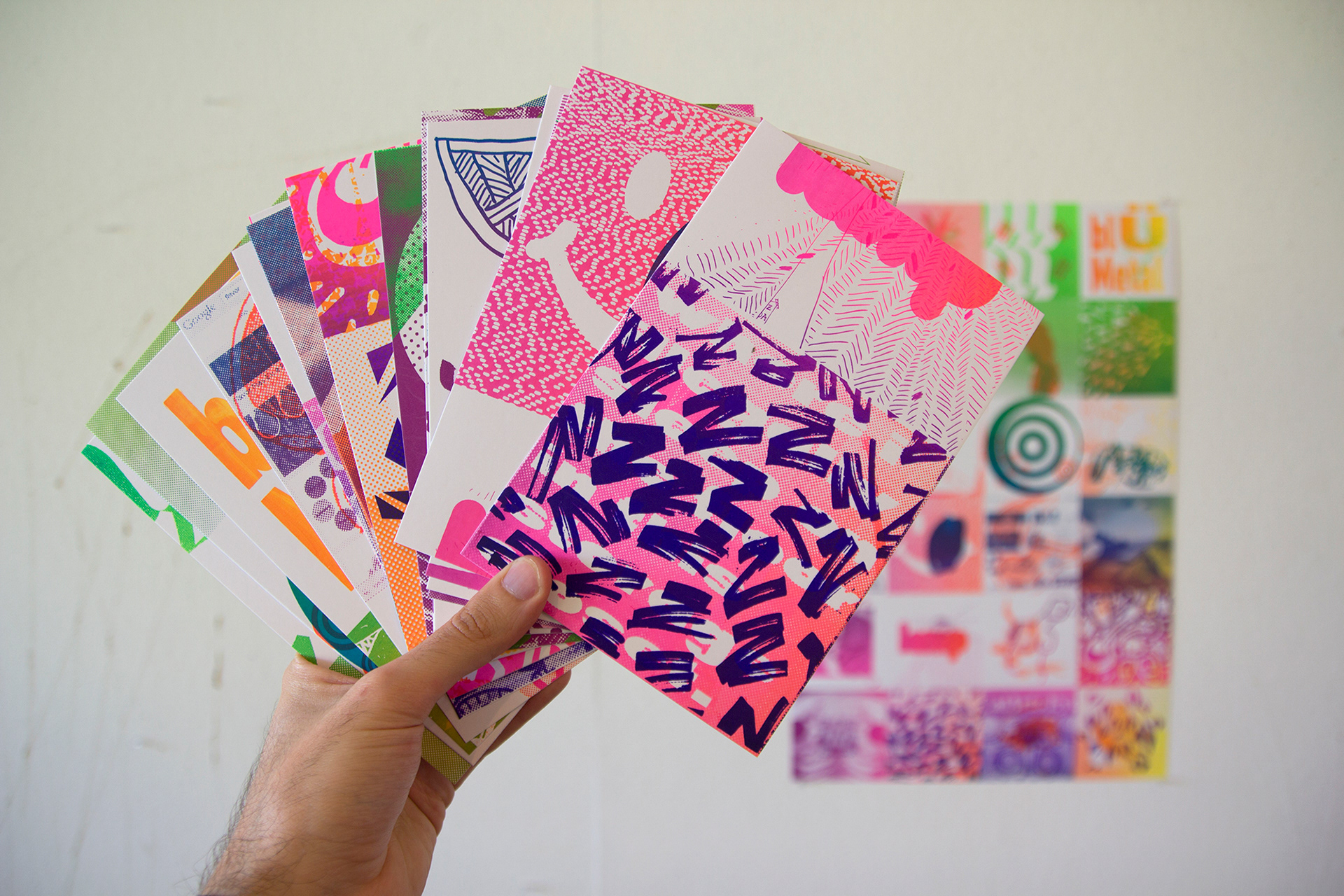 Cartaz modular e/ou 16 cartões-postais. Feito em colaboração com David Chathas. Cada designer criou uma das duas camadas em resposta a uma lista de 24 palavras (uma palavra para cada quadrado). As duas camadas foram sobrepostas, sem que um designer soubesse o que o outro havia criado.